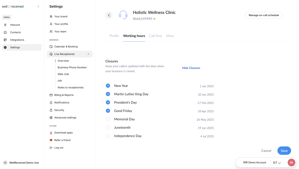 A holiday script is a customized call flow that WellReceived receptionists use during your practice closures or limited hours.